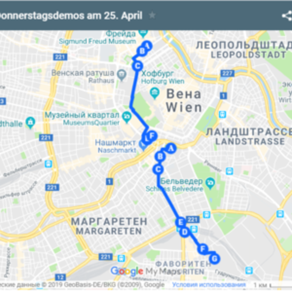 В четверг, 25 апреля, две демонстрации снова вызовут затруднения на дороге: с 10:15 пройдёт демонстрация «Климатический кризис». Демонстранты пройдут от Рессельпарк/Карлсплатц по Виднер Хауптштрассе – Пауланергассе – Фаворитенштрассе – через главный вокзал – Зоннвендгассе – к парку Хельмута Цилька.