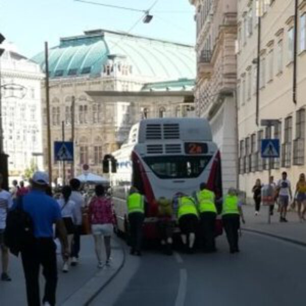 Это произошло в 16:00 на Albertina в Wiener Innenstadt. У сотрудников Wiener Linien не было другого выбора, кроме как оттолкнуть автобус к краю дороги. Благодаря их выносливым мускулам никаких задержек в движении на дороге не возникло.