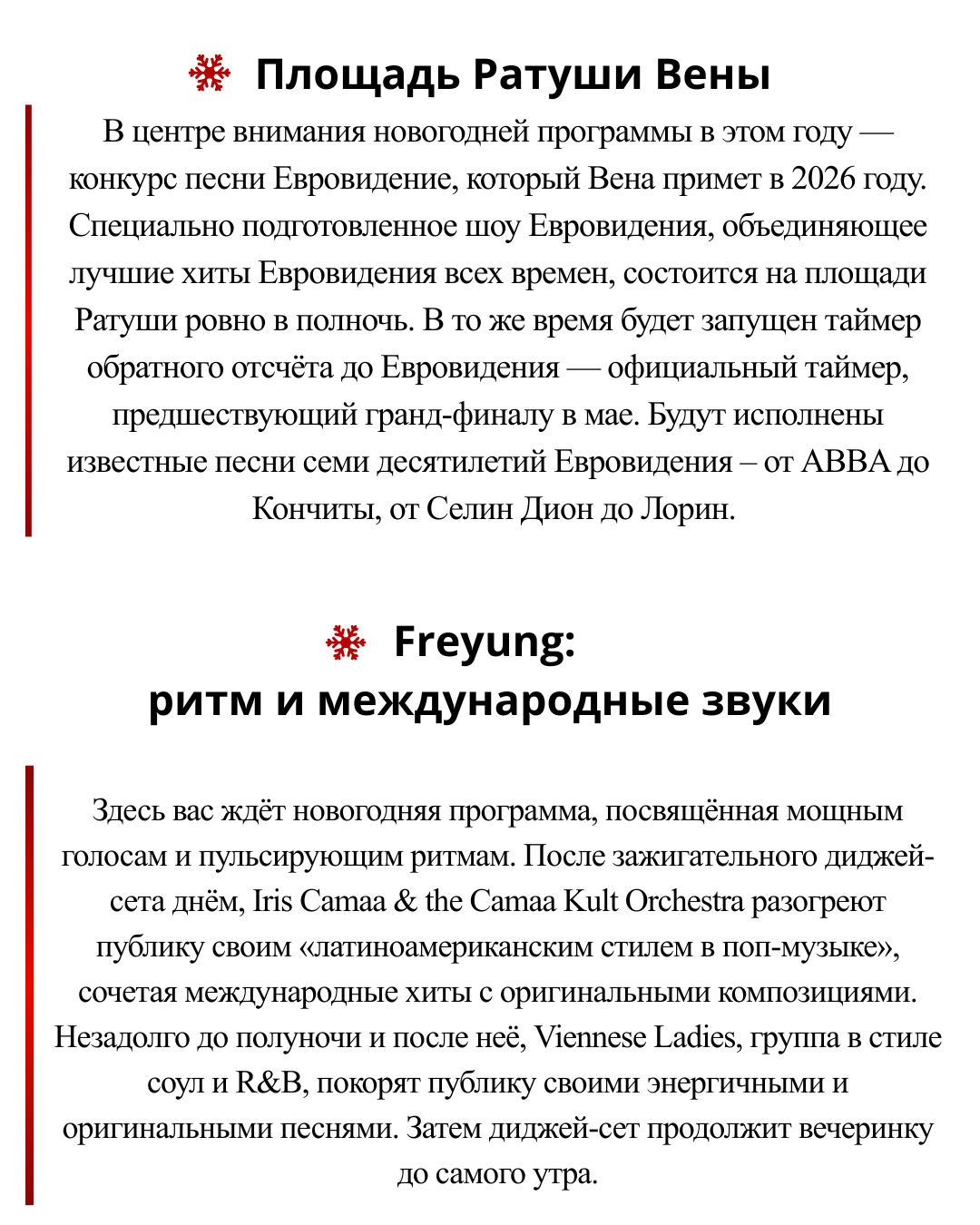 Wiener Silvesterpfad 2025⁄26, включающий более 100 часов программы на восьми сценах, не только поможет встретить Новый год, но и официально даст старт Евровидению 2026.