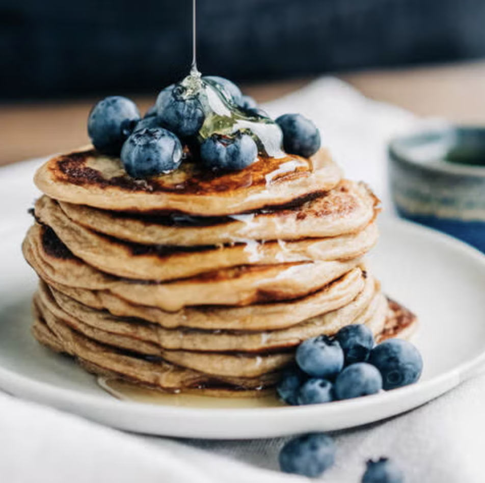 Смешайте ореховое масло, кленовый сироп и лимонный сок. Разложите блины по тарелкам, полейте соусом и подавайте со свежей черникой!