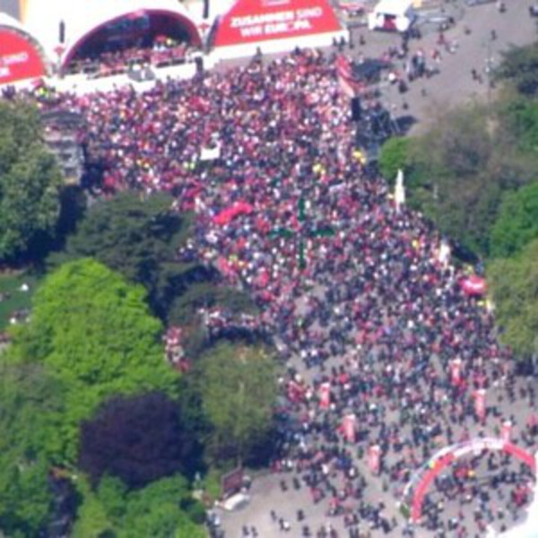Первого мая, в 11:30 полицейские вертолёты, пролетая прямо над Ратхаусплатц, сделали несколько фотографий, чтобы избежать неоправданных обвинений в том, что они занизили число демонстрантов, как в прошлом году.