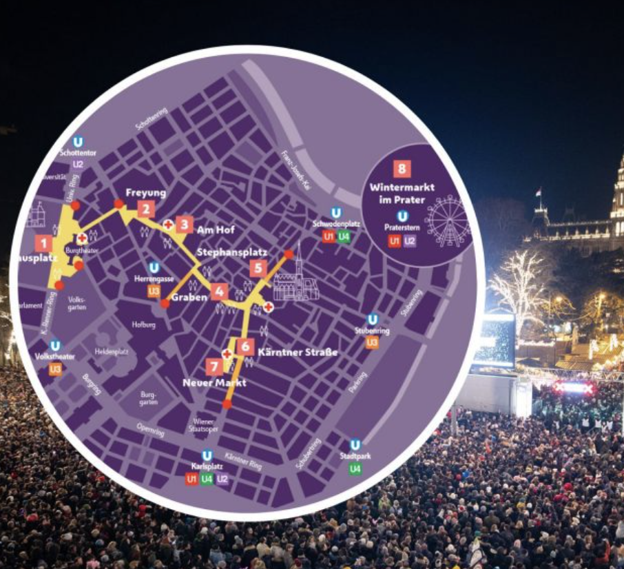 Венский новогодний маршрут 2024⁄2025 предлагает около 100 часов бесплатной праздничной программы в восьми местах в центре Вены и в Пратере.