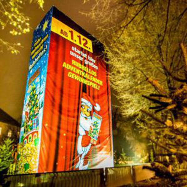 Все те, чьи билеты выпали, поднимаются на стену Adventkalender на ножничном подъемнике, стирая огромной «монетой» одно из трех полей и гарантированно выиграя, потому что каждое скретч-поле приносит выигрыш: 100 евро, 150 евро или 200 евро - 70 евро из них наличными, остаток - на скретч-картах.