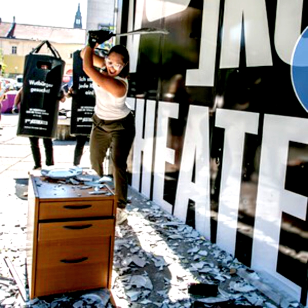 По случаю премьеры «Die Merowinger oder Die totale Familie» перед Фолькстеатром была установлена мобильная Kомната ярости. Жители Вены могут уподобиться главному герою спектакля (C...