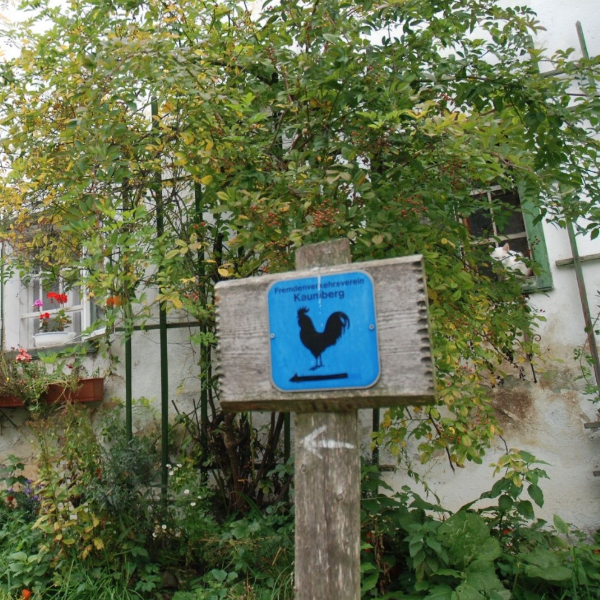 Отсюда следуйте по синим разметкам вниз до тех пор, пока через 250 м не появится указатель Kaumberg Ort, а синие разметки поведут налево на луг. Сначала тропа ведет через ряды деревьев, затем по открытым лугам к могучему дубу с придорожным святилищем. Продолжая движение по лугам и направляясь к церкви, вы вскоре доберетесь до тропы, которая ведет к B18 и снова по ней на Mariazeller Straße.